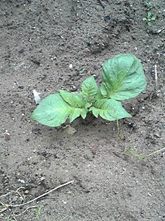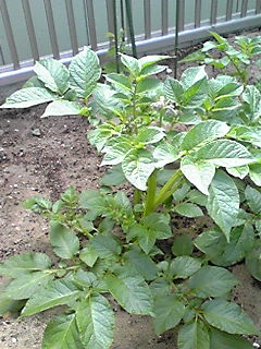 4月初旬に「誰でもができるジャガイモ」と聞いて、自信をつけるために、ホームセンターで<キタヒカリ?>を4個いり297円で購入し、説明書にあったように切断してから4日空気に触れさせて植え付けをしたのです。というより・・・したのでした。