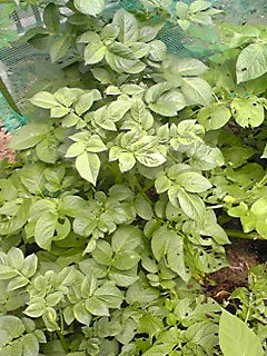愛の思いやりによって(?)溝の中に植え込まれたジャガ君も葉を茂らせ始めたので、地下茎が成長するようにと溝を埋め戻しました。